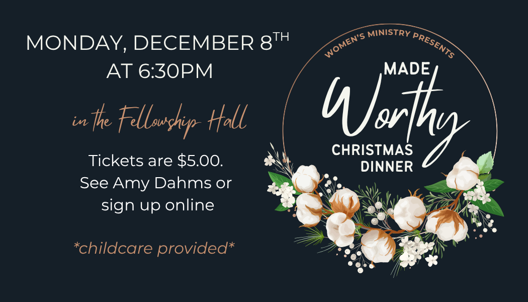 Our Annual Women’s Christmas Dinner will be on Monday, December 8th at 6:30pm. This year’s inspiration is “Made Worthy in Christ”! Invite your friends, tickets are $10.00 a person. Register online here. You can also RSVP in person on Sundays with cash or check. Free childcare is available! Please register by clicking here, so we have enough staff.